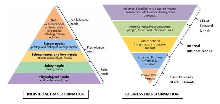 If we use Maslow’s Hierarchy of Needs as an example of a simple framework for human transformation, it is possible to visualize an individual’s transformation journey from meeting their basic needs to self-actualized fulfillment.